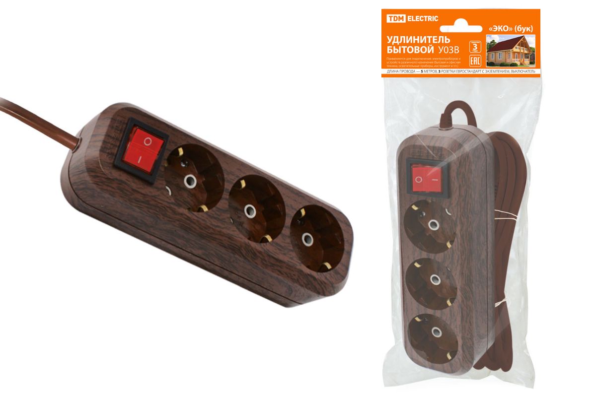 Удлинитель ТДМ SQ1303-3102 бытовой У03В выключатель 3а 5м 2П+3 ПВС 3х1мм? Эко бук 16А/250В