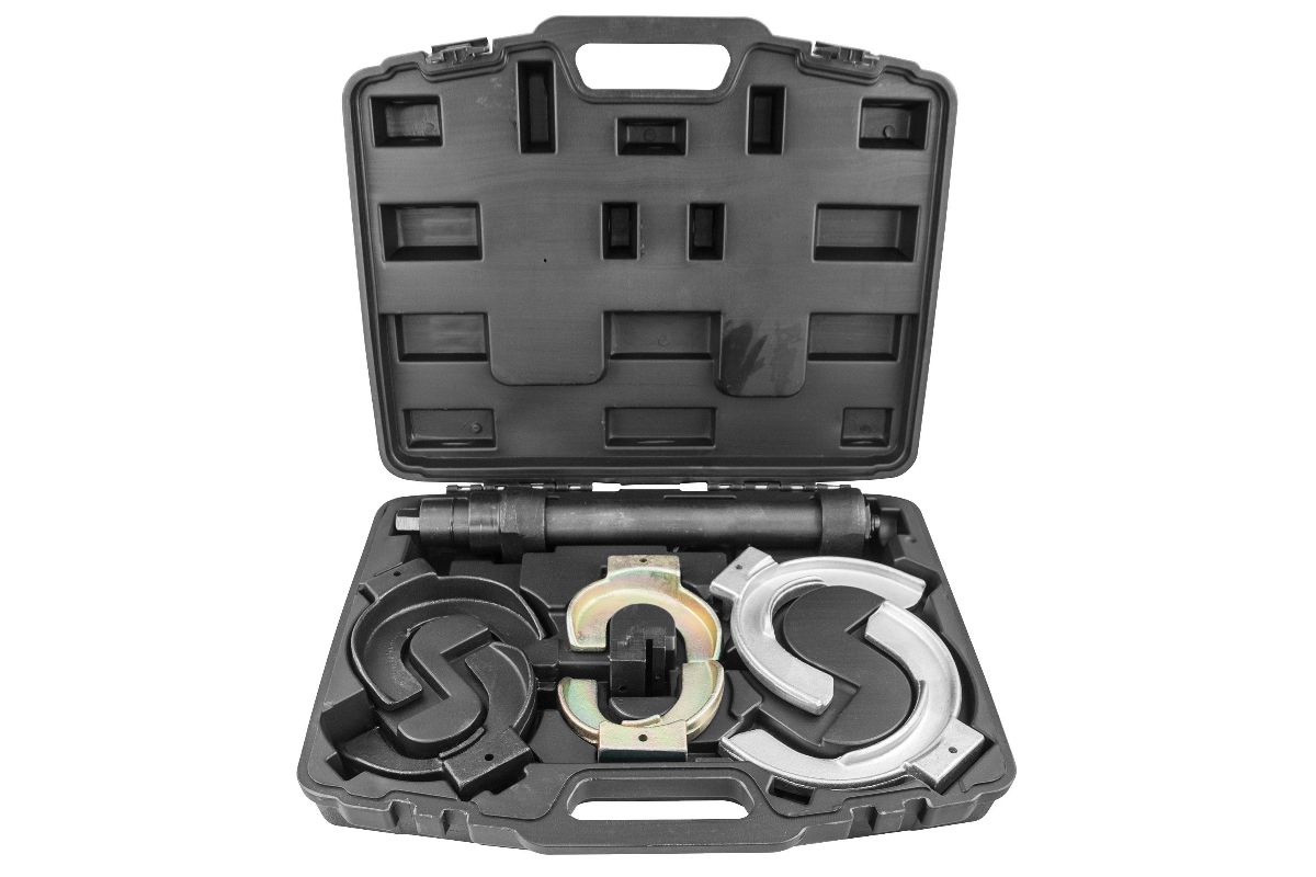 Многофункциональный инструмент, разработанный для современных подвесок типа ''MacPherson''. Используются 6 сменных насадок попарно при производстве работ с цилиндрическими витыми пружинами или вариативно - при обслуживании элементов подвески, снабженных коническими витыми пружинами.
