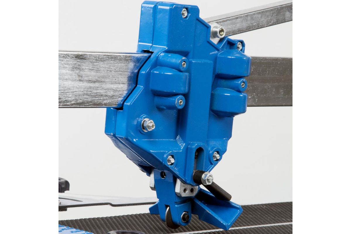 Литая станина из алюминиевого сплава с обрезиненной рабочей поверхностью. Монорельс изготовлен из хромированной стали с антикоррозийным покрытием. Каретка на 9-и подшипниках обеспечивает плавное перемещение. Линейка-угольник для резки плитки под углом 60 гр, регулировки размера и дополнительной фиксации отрезаемой заготовки. Максимальный размер плитки для диагонального реза 840х840 мм.